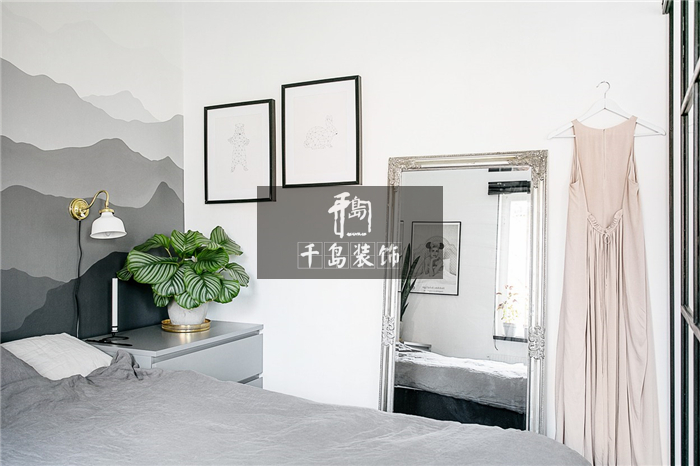 无论是灰白黑等冷色调的运用,还是大片的空间留白,卧室内部更多地还是彰显出浓郁的北欧风情。但巧妙地将色泽变化运用其中,墙壁一面由深及浅的灰色增加了空间的层次感,另一面用黑框装饰画强调北欧风主题,其中金属壁灯的点缀便不显突兀又独具魅力了。