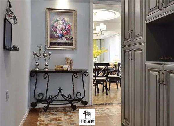 进门映入眼帘的是对面淡蓝色的墙面搭配一副油画,旁边摆放了一个铁艺的观景台,摆上小饰品很雅致,另一边做了到顶的收纳柜满足了屋主的收纳,柜子做的是灰色的做工精致,柜门做了方框的装饰看起来比较稳重。