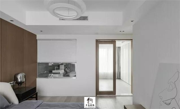 主卧包含衣帽间和卫生间,用玻璃进行隔断,衣帽间则是半通透的玻璃推拉门隔断,可以让每个空间采光和空气流通都得到满足。