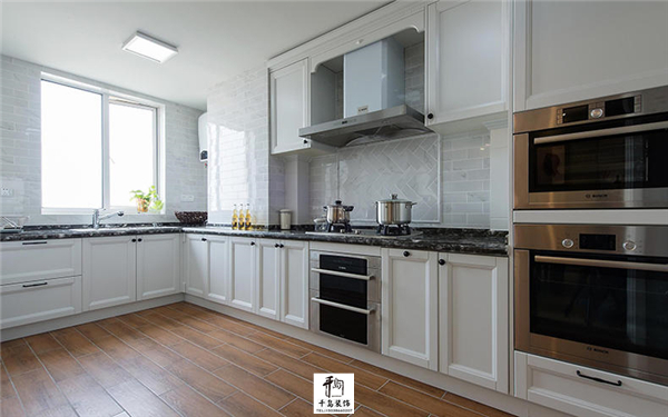 厨房装的也是很敞亮,打造的是一个转角设计的橱柜,白色的橱柜很是美式风格,吊柜的设计也是很合理,这边内嵌式安装的厨房电器,这样设计平时使用很是方便,窗户的地方采光效果很是好,地面虽然铺的是木地板,但是与橱柜的颜色很搭配。