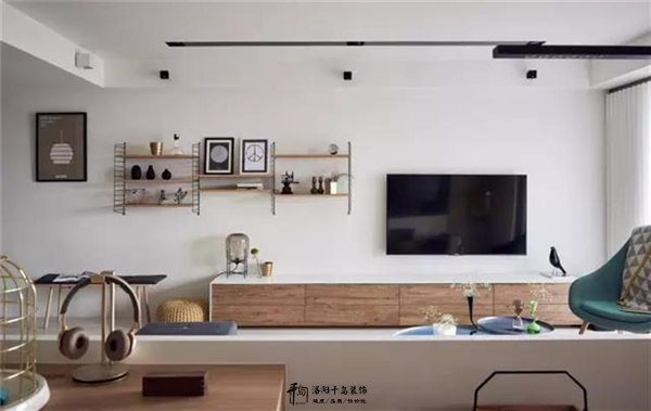 电视背景墙没有选择复杂的设计,简简单单的白色墙面,配上了置物架的设计,让墙壁不显空泛。