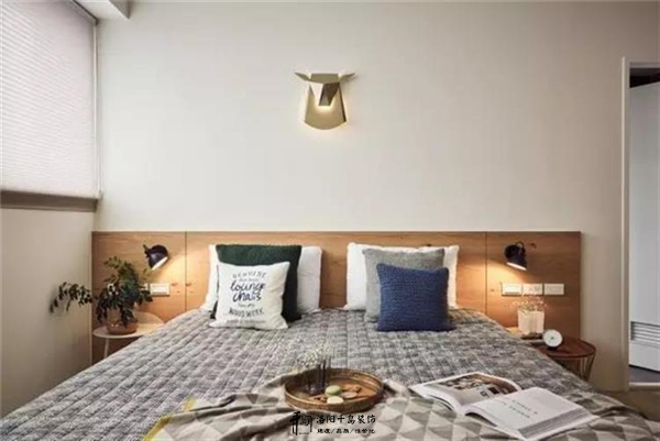 主卧里使用了大面积的白色和原木色进行搭配,使得卧室颇具素雅格调。具有北欧元素的鹿头灯饰,让照明、装饰两大功能完美呈现出来。