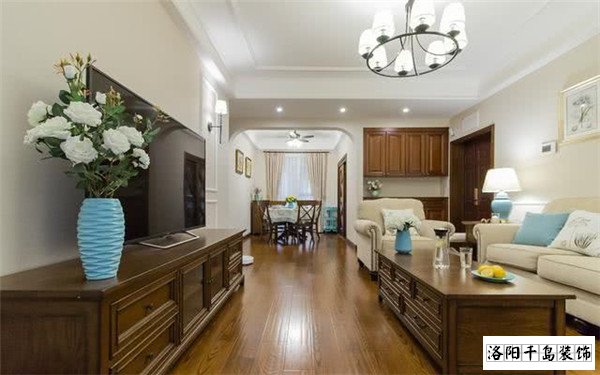 家里的房子刚装修好,是用的美式风格,经过洛阳千岛装饰的精心设计,看上去特别漂亮。进门后就能看到家里的客厅,首先在墙壁的位置,摆放着一个电视柜,上面摆着花植。另一边是一个白色的柔然沙发,上面的吊顶处挂着一圈吊灯,非常有优雅感。